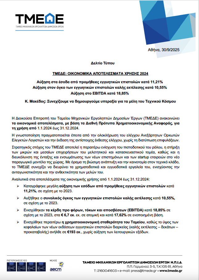 Το Τ.Μ.Ε.Δ.Ε., στο πλαίσιο του ψηφιακού μετασχηματισμού του, αναβαθμίζει και εξατομικεύει τις υπηρεσίες που παρέχει στους Πιστούχους του. Η μείωση της γραφειοκρατίας, η επιτάχυνση των διαδικασιών, η διαφάνεια και η αποτελεσματικότητα αποτελούν κεντρική στρατηγική επιλογή της Διοίκησης, προκειμένου να ενισχυθεί ουσιαστικά ο Κλάδος. Για την καλύτερη εξυπηρέτησή σας παρακαλούμε να προβείτε σε επαναβεβαίωση των στοιχείων σας.